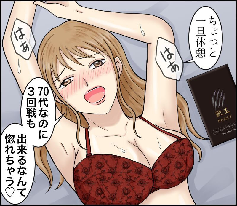 私が60代で妻が40代、年齢差から妻の求めるSEXを叶えられませんでした。でも獣王BEASTを飲み始めてからというもの、逆に自分が毎晩求めるようになってしまい勃起が止まりません(笑)これはバイアグラより絶対良いです。
